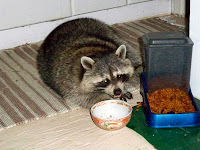 I suspect that this raccoon was hand-raised as a kit and then released to this neighbourhood. He is too comfortable with the cats and house. Sometimes, he comes in and does not even eat; he just wants to be in the house. Last night, at around 5:00 am, I think he snuck in and enjoyed roaming around. He may have wandered into my bedroom and, discovering my hand over the side of the bed, started nipping on my fingers. I woke to sharp teeth nipping my finger tips. It could have been my cat but he's never done something such as this before and when I woke with a start, something hightailed it out of the bedroom and made for the cat door.