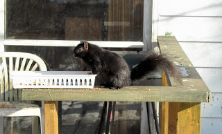 I didn't see Oscar or Honey today, but Jackie, her beau and Missy were up and about. I hadn't planned on putting out nuts today as they are supposed to be a treat. However, as I watched them eat seeds from the inside sanctuary, Missy climbed to the nut tray and stared at me.